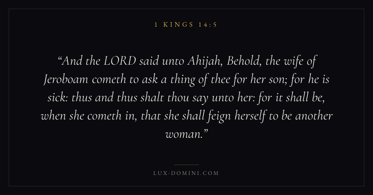 And the LORD said unto Ahijah, Behold, the wife of Jeroboam cometh to ask a thing of thee for her son; for he is sick: thus and thus shalt thou say unto her: for it shall be, when she cometh in, that she shall feign herself to be another woman.