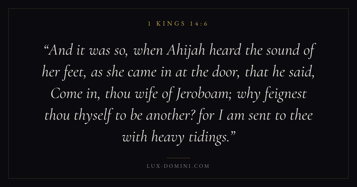 And it was so, when Ahijah heard the sound of her feet, as she came in at the door, that he said, Come in, thou wife of Jeroboam; why feignest thou thyself to be another? for I am sent to thee with heavy tidings.