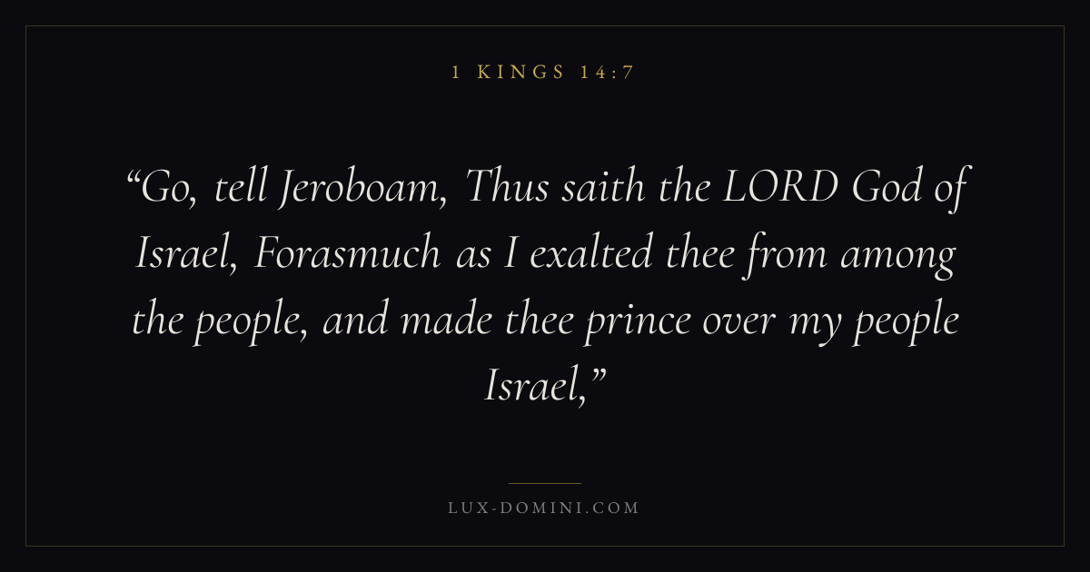 Go, tell Jeroboam, Thus saith the LORD God of Israel, Forasmuch as I exalted thee from among the people, and made thee prince over my people Israel,