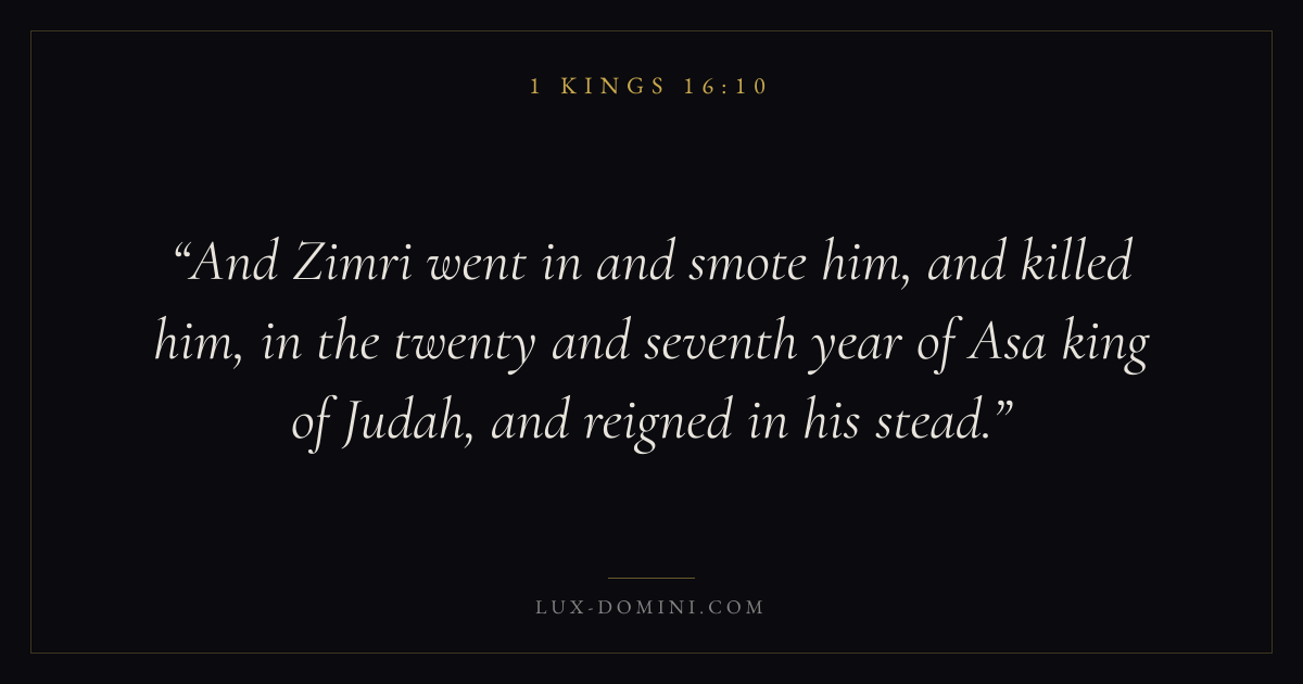 And Zimri went in and smote him, and killed him, in the twenty and seventh year of Asa king of Judah, and reigned in his stead.