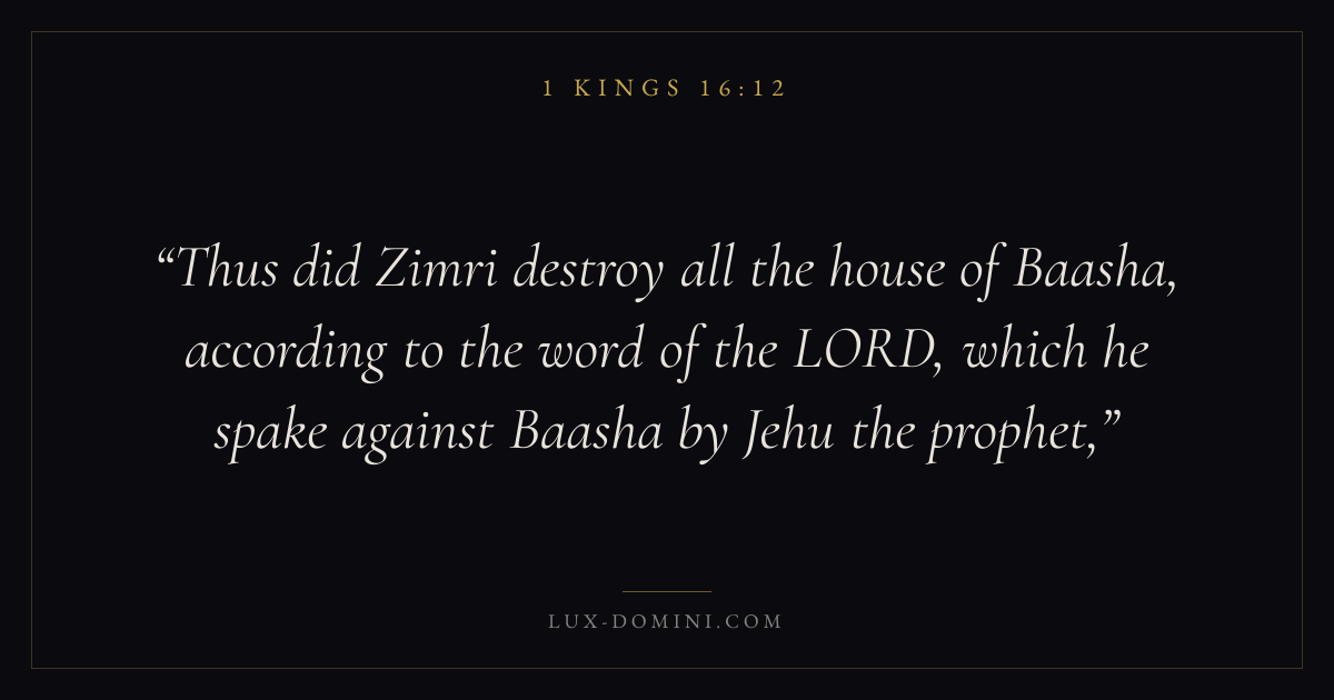 Thus did Zimri destroy all the house of Baasha, according to the word of the LORD, which he spake against Baasha by Jehu the prophet,