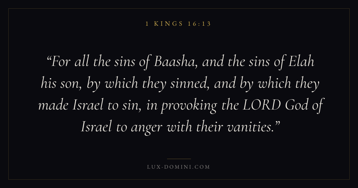 For all the sins of Baasha, and the sins of Elah his son, by which they sinned, and by which they made Israel to sin, in provoking the LORD God of Israel to anger with their vanities.