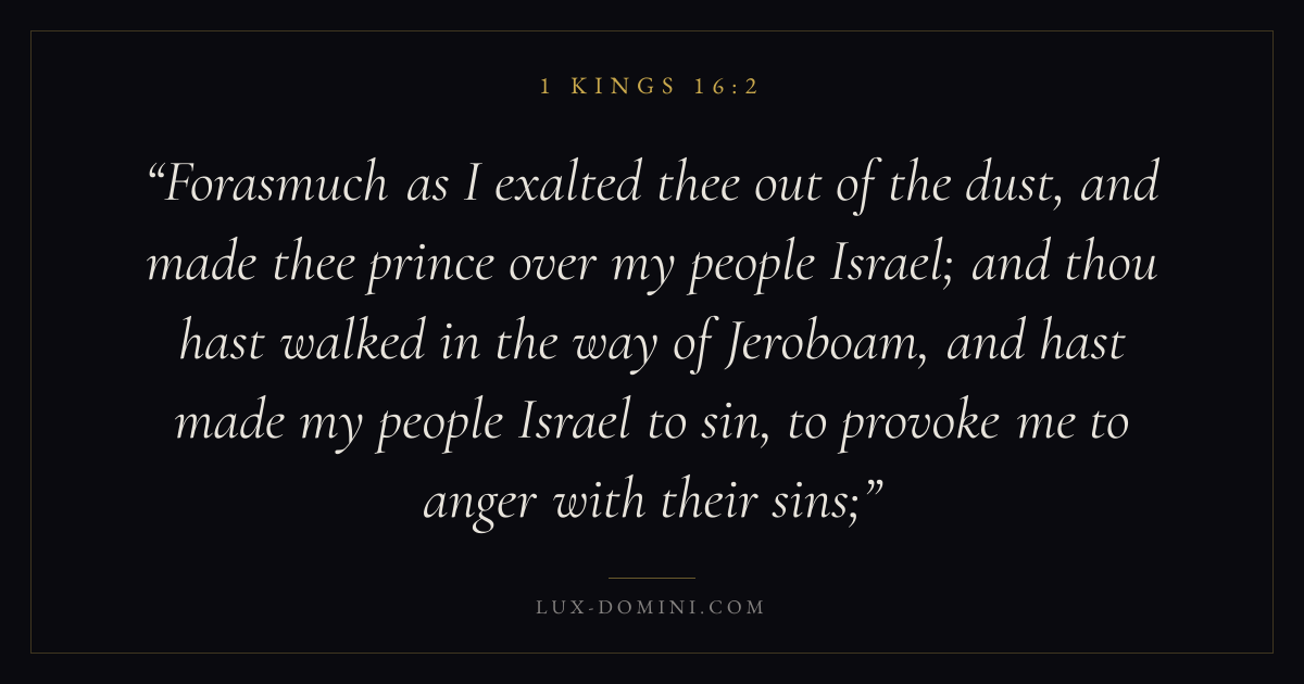 Forasmuch as I exalted thee out of the dust, and made thee prince over my people Israel; and thou hast walked in the way of Jeroboam, and hast made my people Israel to sin, to provoke me to anger with their sins;