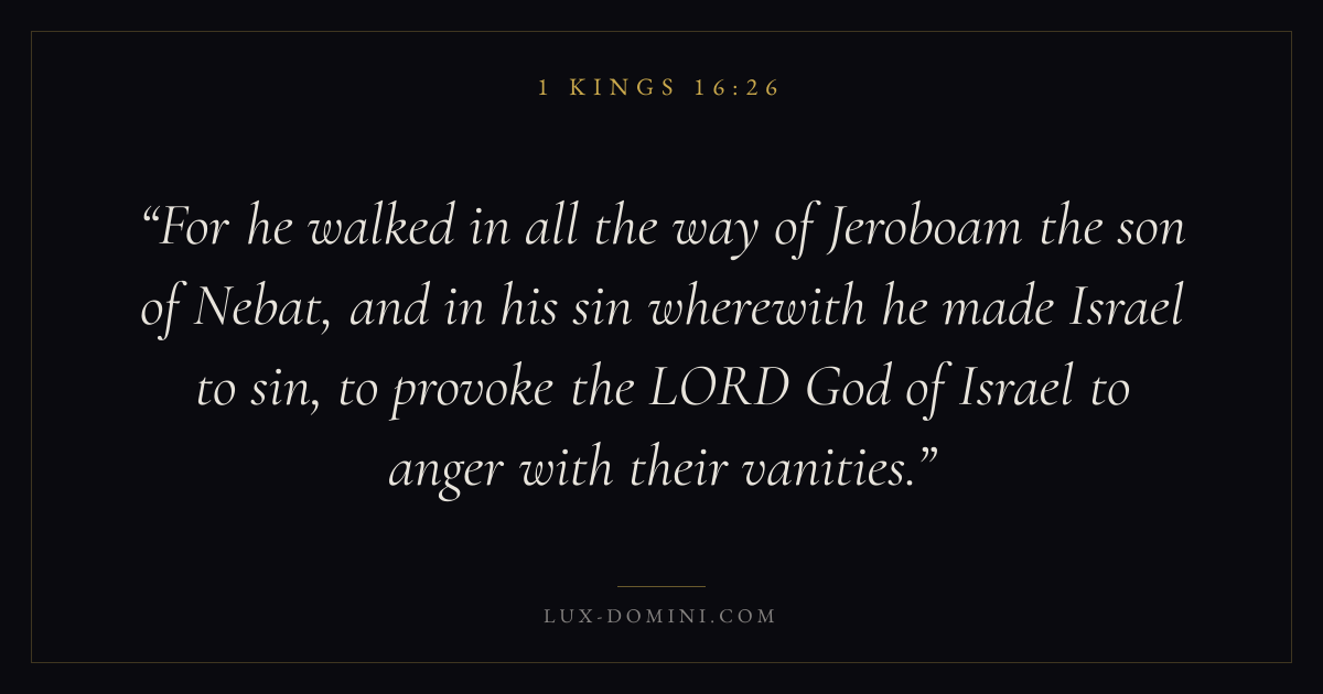 For he walked in all the way of Jeroboam the son of Nebat, and in his sin wherewith he made Israel to sin, to provoke the LORD God of Israel to anger with their vanities.