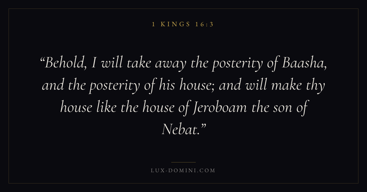Behold, I will take away the posterity of Baasha, and the posterity of his house; and will make thy house like the house of Jeroboam the son of Nebat.