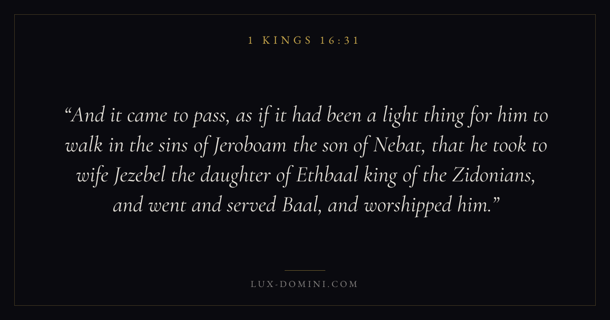 And it came to pass, as if it had been a light thing for him to walk in the sins of Jeroboam the son of Nebat, that he took to wife Jezebel the daughter of Ethbaal king of the Zidonians, and went and served Baal, and worshipped him.