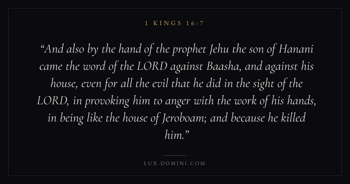 And also by the hand of the prophet Jehu the son of Hanani came the word of the LORD against Baasha, and against his house, even for all the evil that he did in the sight of the LORD, in provoking him to anger with the work of his hands, in being like the house of Jeroboam; and because he killed him.