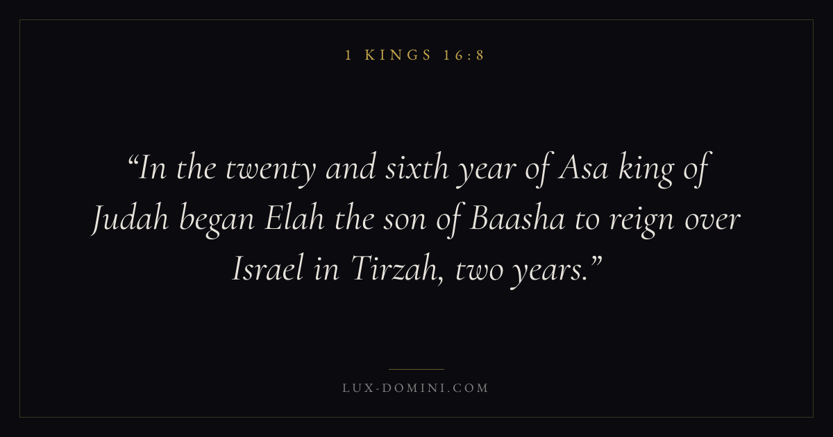 In the twenty and sixth year of Asa king of Judah began Elah the son of Baasha to reign over Israel in Tirzah, two years.