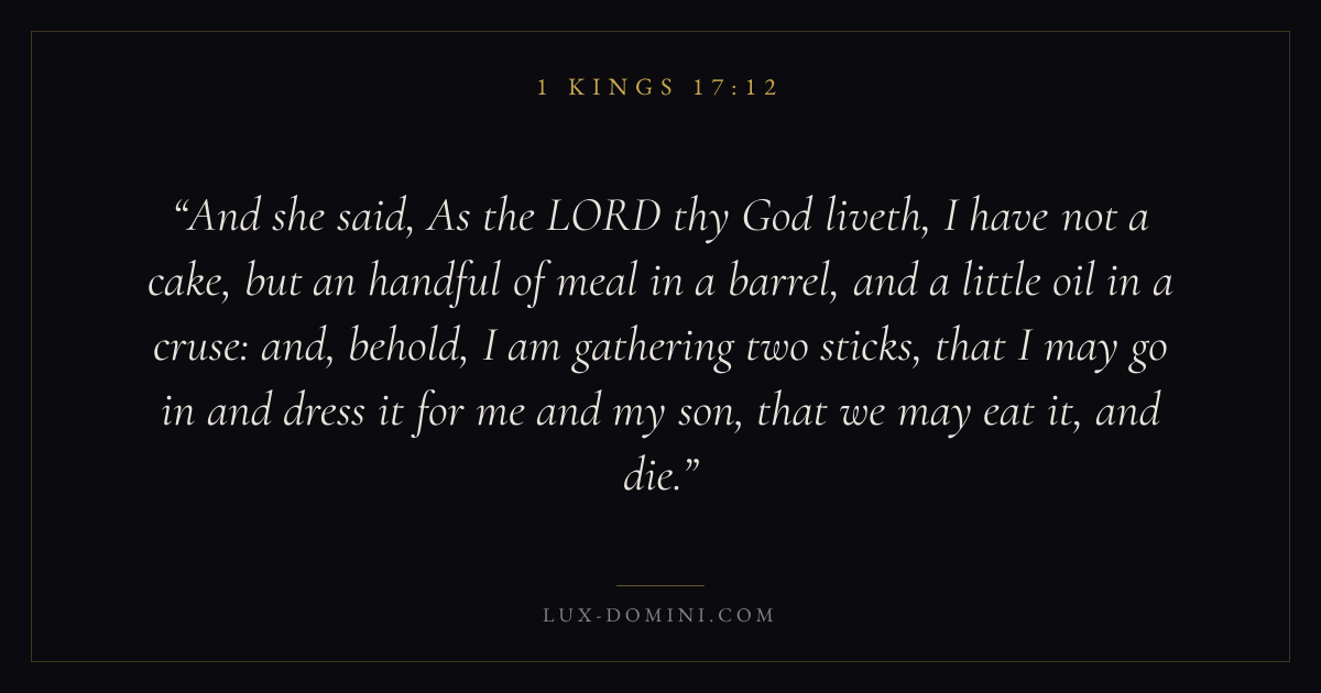 And she said, As the LORD thy God liveth, I have not a cake, but an handful of meal in a barrel, and a little oil in a cruse: and, behold, I am gathering two sticks, that I may go in and dress it for me and my son, that we may eat it, and die.