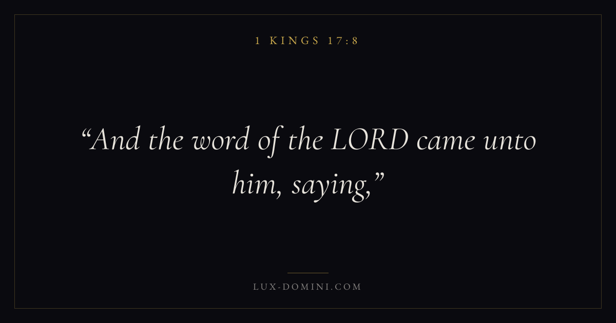 Books / 1 Kings / Chapter 17 / Verse 8 ← 1 Kings 17:7 1 Kings 17:8 1 Kings 17:9 → And the word of the LORD came unto him, saying, Download verse card Share on Twitter Share on Facebook Pin it ✦ Key themes WisdomJustice and mercyTruthTemple Read with 1 Kings 17:91 Kings 17:10Proverbs 1:7James 1:5 Related topics Bible verses about wisdomBible verses about justice and mercyBible verses about truth ✦ 1 Kings Chapter 17 verses V. 1 V. 2 V. 3 V. 4 V. 5 V. 6 V. 7 V. 8 V. 9 V. 10 V. 11 V. 12 V. 13 V. 14 V. 15 V. 16 V. 17 V. 18 V. 19 V. 20 V. 21 V. 22 V. 23 V. 24