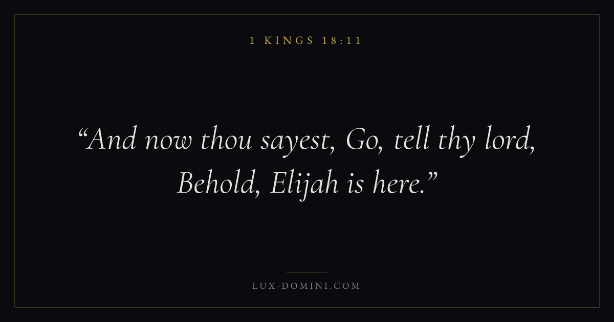 Books / 1 Kings / Chapter 18 / Verse 11 ← 1 Kings 18:10 1 Kings 18:11 1 Kings 18:12 → And now thou sayest, Go, tell thy lord, Behold, Elijah is here. Download verse card Share on Twitter Share on Facebook Pin it ✦ Key themes WisdomJustice and mercyHumilityTemple Read with 1 Kings 18:101 Kings 18:12Proverbs 1:7James 1:5 Related topics Bible verses about wisdomBible verses about justice and mercyBible verses about humility ✦ 1 Kings Chapter 18 verses V. 1 V. 2 V. 3 V. 4 V. 5 V. 6 V. 7 V. 8 V. 9 V. 10 V. 11 V. 12 V. 13 V. 14 V. 15 V. 16 V. 17 V. 18 V. 19 V. 20 V. 21 V. 22 V. 23 V. 24 V. 25 V. 26 V. 27 V. 28 V. 29 V. 30 V. 31 V. 32 V. 33 V. 34 V. 35 V. 36 V. 37 V. 38 V. 39 V. 40 V. 41 V. 42 V. 43 V. 44 V. 45 V. 46