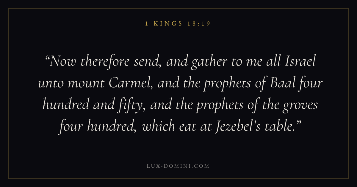 Now therefore send, and gather to me all Israel unto mount Carmel, and the prophets of Baal four hundred and fifty, and the prophets of the groves four hundred, which eat at Jezebel’s table.