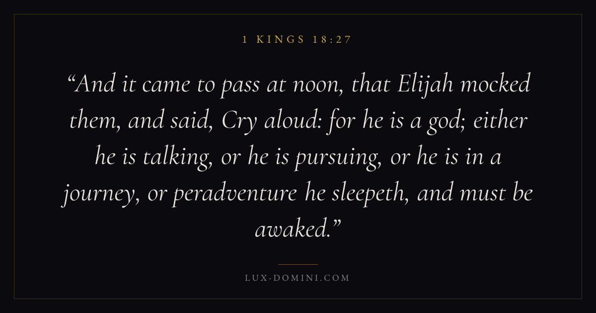 And it came to pass at noon, that Elijah mocked them, and said, Cry aloud: for he is a god; either he is talking, or he is pursuing, or he is in a journey, or peradventure he sleepeth, and must be awaked.