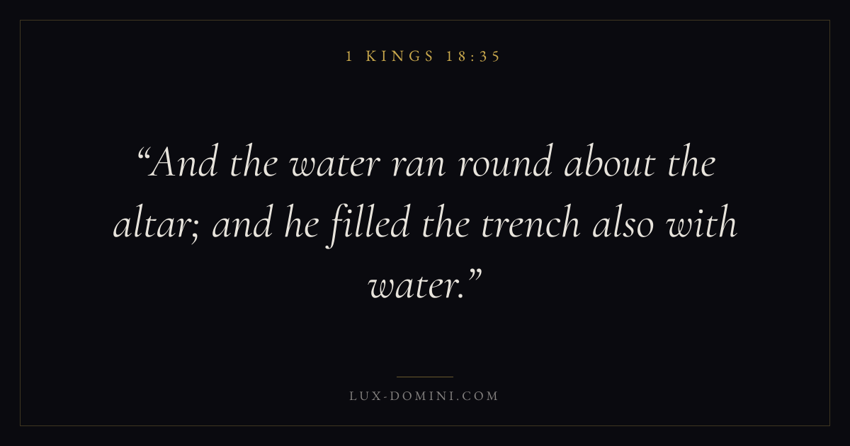 Books / 1 Kings / Chapter 18 / Verse 35 ← 1 Kings 18:34 1 Kings 18:35 1 Kings 18:36 → And the water ran round about the altar; and he filled the trench also with water. Download verse card Share on Twitter Share on Facebook Pin it ✦ Key themes WisdomJustice and mercyTempleIdolatry Read with 1 Kings 18:331 Kings 18:34Proverbs 1:7James 1:5 Related topics Bible verses about wisdomBible verses about justice and mercy ✦ 1 Kings Chapter 18 verses V. 1 V. 2 V. 3 V. 4 V. 5 V. 6 V. 7 V. 8 V. 9 V. 10 V. 11 V. 12 V. 13 V. 14 V. 15 V. 16 V. 17 V. 18 V. 19 V. 20 V. 21 V. 22 V. 23 V. 24 V. 25 V. 26 V. 27 V. 28 V. 29 V. 30 V. 31 V. 32 V. 33 V. 34 V. 35 V. 36 V. 37 V. 38 V. 39 V. 40 V. 41 V. 42 V. 43 V. 44 V. 45 V. 46