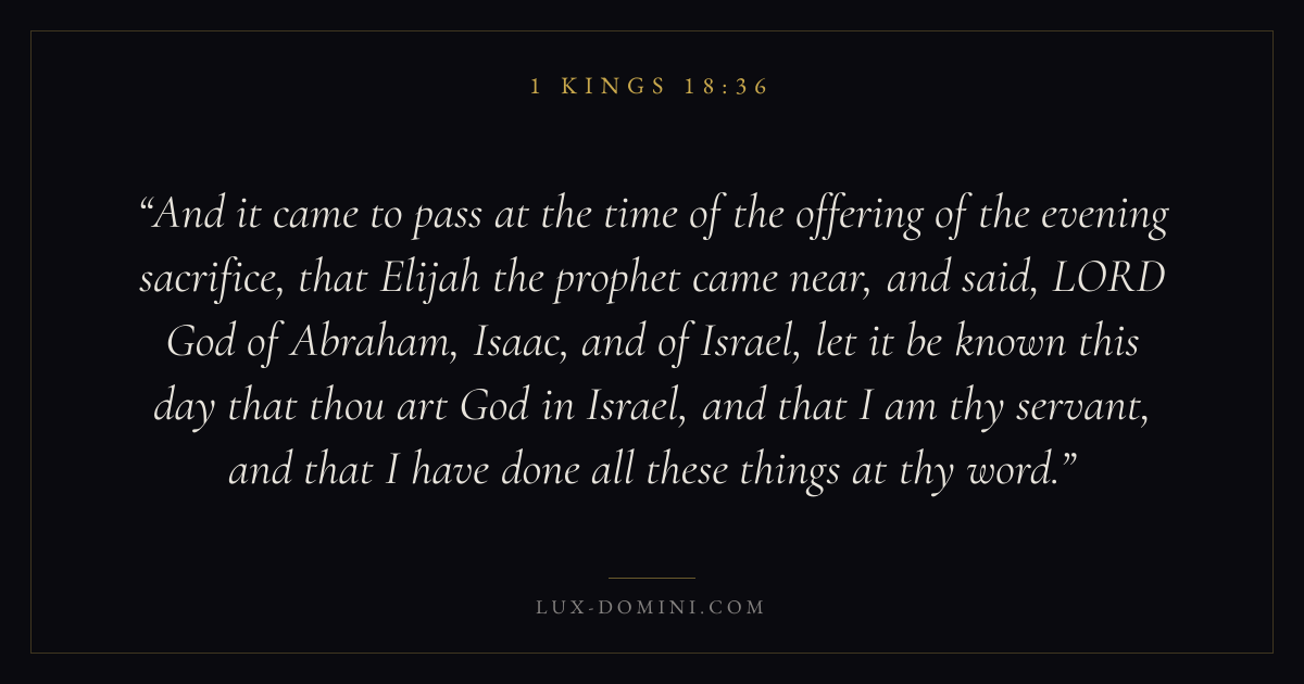 And it came to pass at the time of the offering of the evening sacrifice, that Elijah the prophet came near, and said, LORD God of Abraham, Isaac, and of Israel, let it be known this day that thou art God in Israel, and that I am thy servant, and that I have done all these things at thy word.