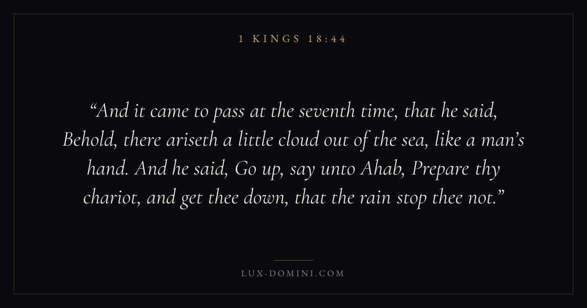 And it came to pass at the seventh time, that he said, Behold, there ariseth a little cloud out of the sea, like a man’s hand. And he said, Go up, say unto Ahab, Prepare thy chariot, and get thee down, that the rain stop thee not.