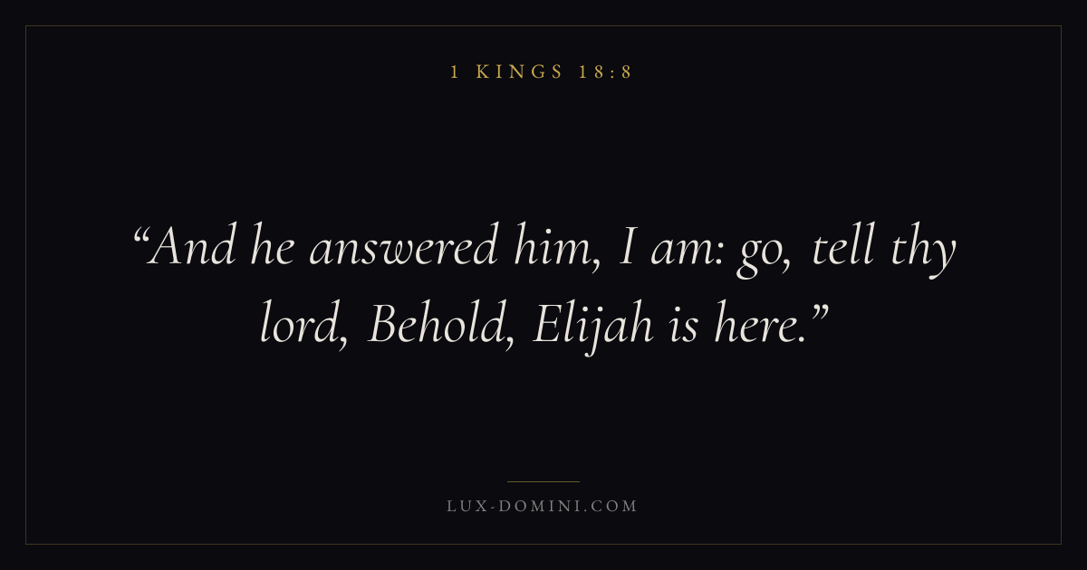 Books / 1 Kings / Chapter 18 / Verse 8 ← 1 Kings 18:7 1 Kings 18:8 1 Kings 18:9 → And he answered him, I am: go, tell thy lord, Behold, Elijah is here. Download verse card Share on Twitter Share on Facebook Pin it ✦ Key themes WisdomJustice and mercyHumilityTemple Read with 1 Kings 18:71 Kings 18:9Proverbs 1:7James 1:5 Related topics Bible verses about wisdomBible verses about justice and mercyBible verses about humility ✦ 1 Kings Chapter 18 verses V. 1 V. 2 V. 3 V. 4 V. 5 V. 6 V. 7 V. 8 V. 9 V. 10 V. 11 V. 12 V. 13 V. 14 V. 15 V. 16 V. 17 V. 18 V. 19 V. 20 V. 21 V. 22 V. 23 V. 24 V. 25 V. 26 V. 27 V. 28 V. 29 V. 30 V. 31 V. 32 V. 33 V. 34 V. 35 V. 36 V. 37 V. 38 V. 39 V. 40 V. 41 V. 42 V. 43 V. 44 V. 45 V. 46