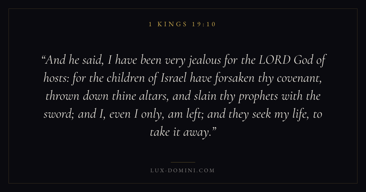 And he said, I have been very jealous for the LORD God of hosts: for the children of Israel have forsaken thy covenant, thrown down thine altars, and slain thy prophets with the sword; and I, even I only, am left; and they seek my life, to take it away.