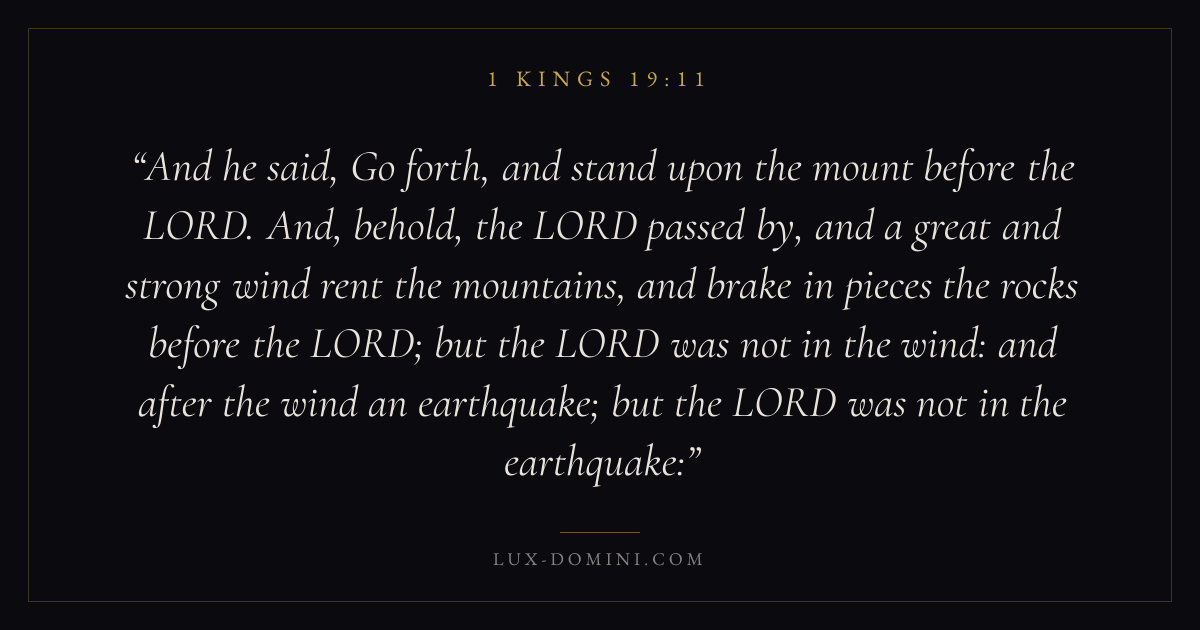 And he said, Go forth, and stand upon the mount before the LORD. And, behold, the LORD passed by, and a great and strong wind rent the mountains, and brake in pieces the rocks before the LORD; but the LORD was not in the wind: and after the wind an earthquake; but the LORD was not in the earthquake: