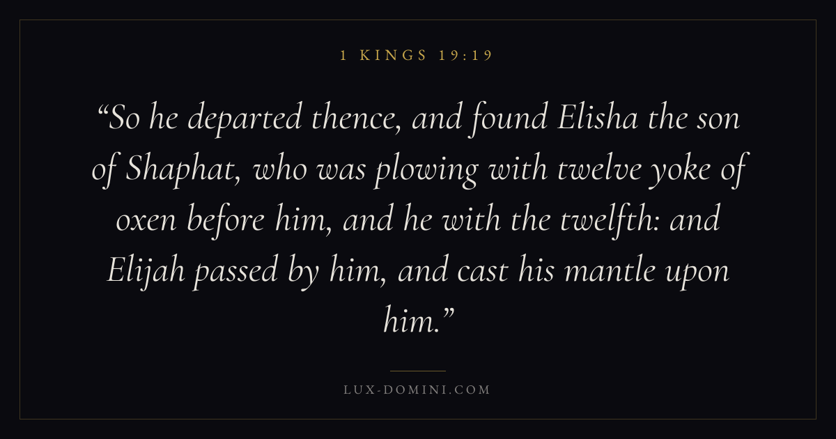 So he departed thence, and found Elisha the son of Shaphat, who was plowing with twelve yoke of oxen before him, and he with the twelfth: and Elijah passed by him, and cast his mantle upon him.