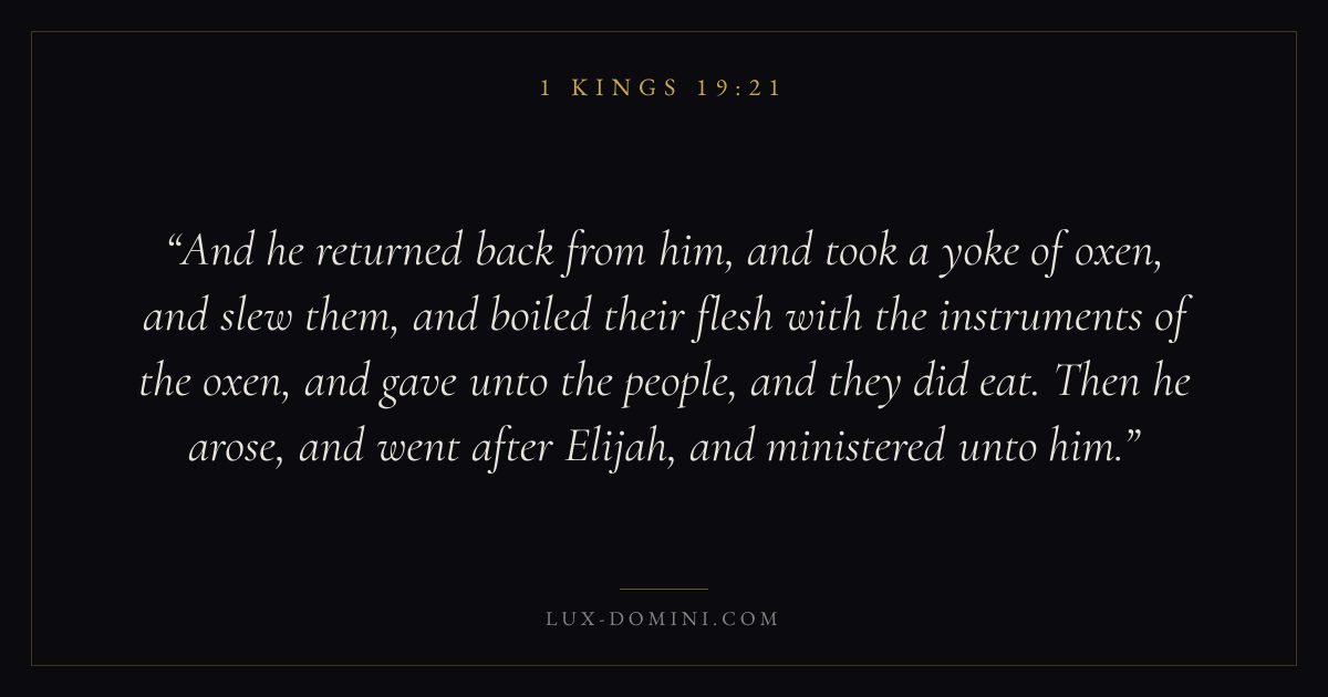 And he returned back from him, and took a yoke of oxen, and slew them, and boiled their flesh with the instruments of the oxen, and gave unto the people, and they did eat. Then he arose, and went after Elijah, and ministered unto him.