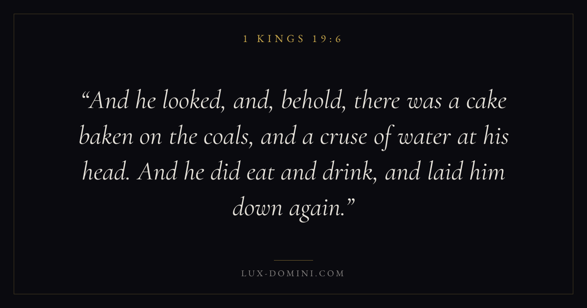 And he looked, and, behold, there was a cake baken on the coals, and a cruse of water at his head. And he did eat and drink, and laid him down again.