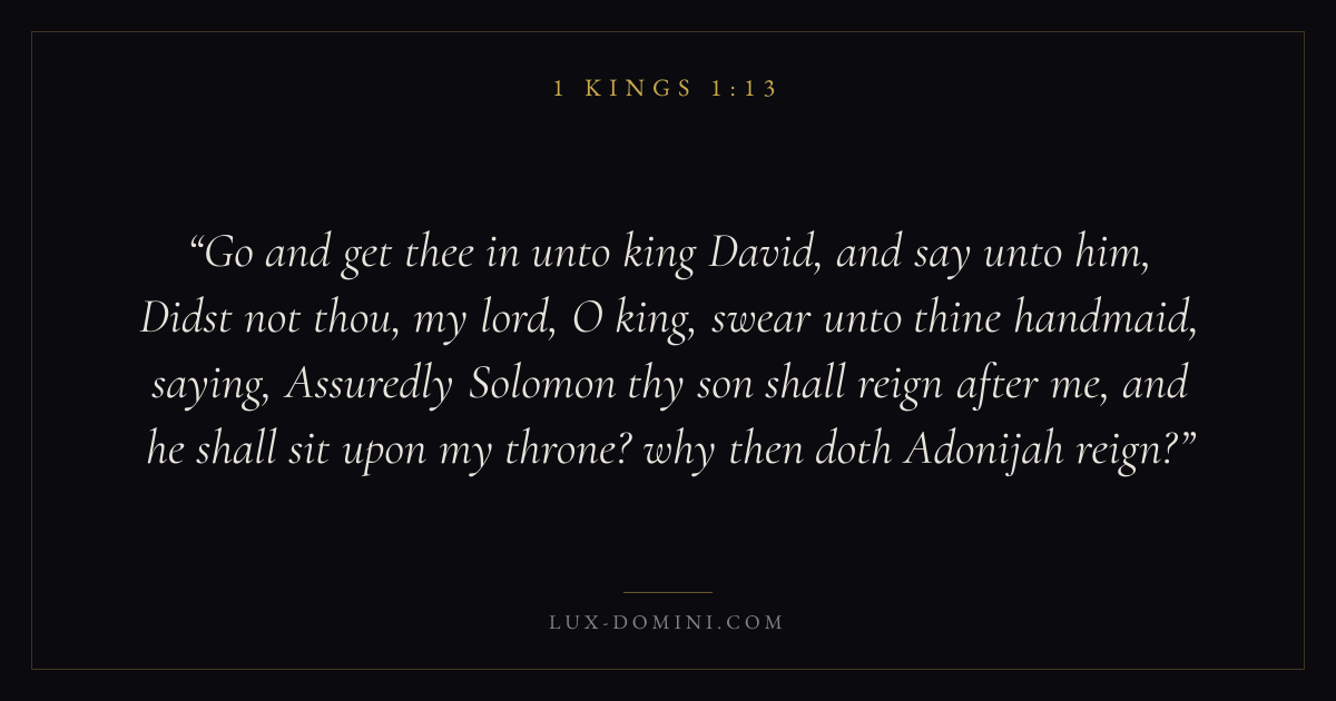 Go and get thee in unto king David, and say unto him, Didst not thou, my lord, O king, swear unto thine handmaid, saying, Assuredly Solomon thy son shall reign after me, and he shall sit upon my throne? why then doth Adonijah reign?