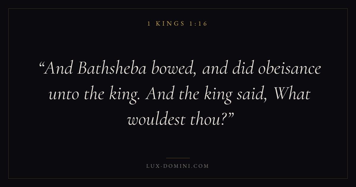 Books / 1 Kings / Chapter 1 / Verse 16 ← 1 Kings 1:15 1 Kings 1:16 1 Kings 1:17 → And Bathsheba bowed, and did obeisance unto the king. And the king said, What wouldest thou? Download verse card Share on Twitter Share on Facebook Pin it ✦ Key themes WisdomJustice and mercySalvationTemple Read with 1 Kings 1:151 Kings 1:17Proverbs 1:7James 1:5 Related topics Bible verses about wisdomBible verses about justice and mercyBible verses about salvation ✦ 1 Kings Chapter 1 verses V. 1 V. 2 V. 3 V. 4 V. 5 V. 6 V. 7 V. 8 V. 9 V. 10 V. 11 V. 12 V. 13 V. 14 V. 15 V. 16 V. 17 V. 18 V. 19 V. 20 V. 21 V. 22 V. 23 V. 24 V. 25 V. 26 V. 27 V. 28 V. 29 V. 30 V. 31 V. 32 V. 33 V. 34 V. 35 V. 36 V. 37 V. 38 V. 39 V. 40 V. 41 V. 42 V. 43 V. 44 V. 45 V. 46 V. 47 V. 48 V. 49 V. 50 V. 51 V. 52 V. 53