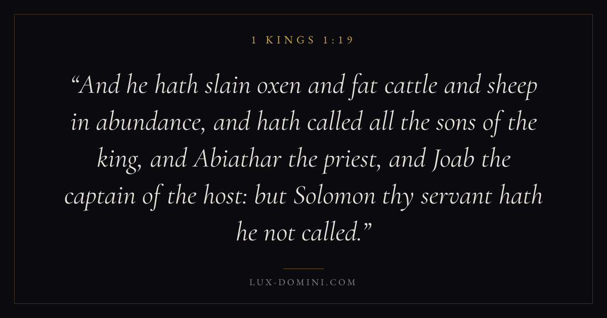 And he hath slain oxen and fat cattle and sheep in abundance, and hath called all the sons of the king, and Abiathar the priest, and Joab the captain of the host: but Solomon thy servant hath he not called.