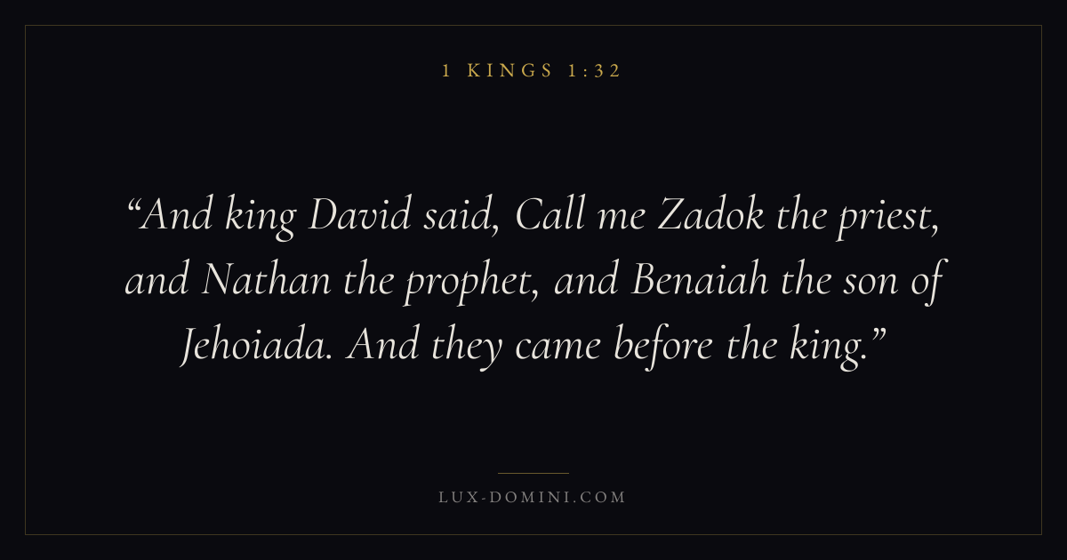 And king David said, Call me Zadok the priest, and Nathan the prophet, and Benaiah the son of Jehoiada. And they came before the king.