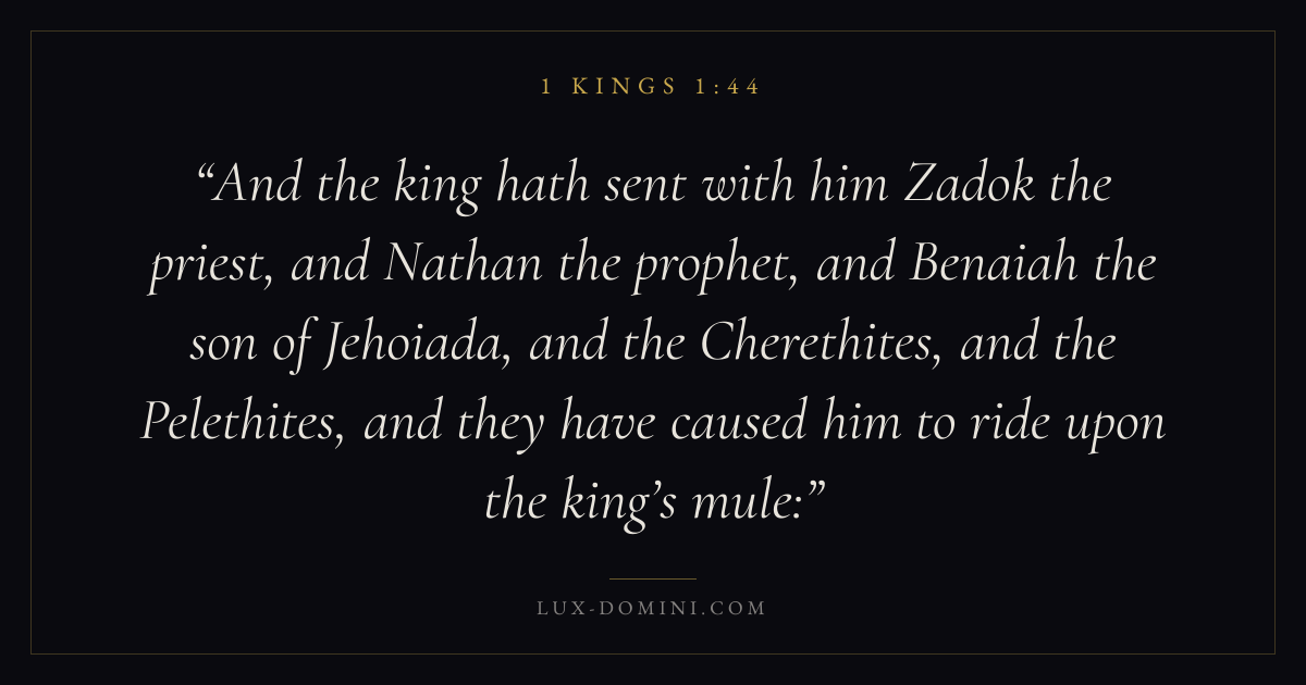And the king hath sent with him Zadok the priest, and Nathan the prophet, and Benaiah the son of Jehoiada, and the Cherethites, and the Pelethites, and they have caused him to ride upon the king’s mule:
