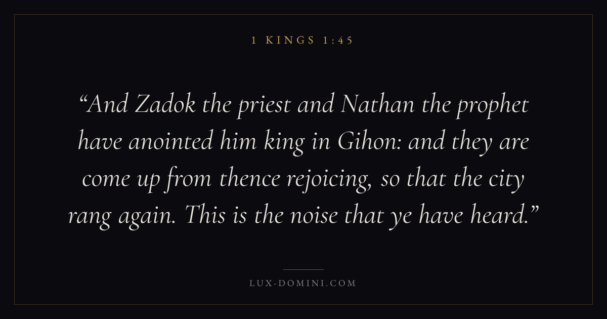 And Zadok the priest and Nathan the prophet have anointed him king in Gihon: and they are come up from thence rejoicing, so that the city rang again. This is the noise that ye have heard.