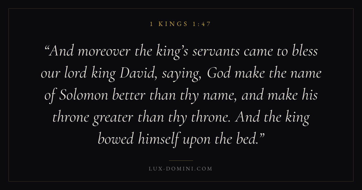And moreover the king’s servants came to bless our lord king David, saying, God make the name of Solomon better than thy name, and make his throne greater than thy throne. And the king bowed himself upon the bed.
