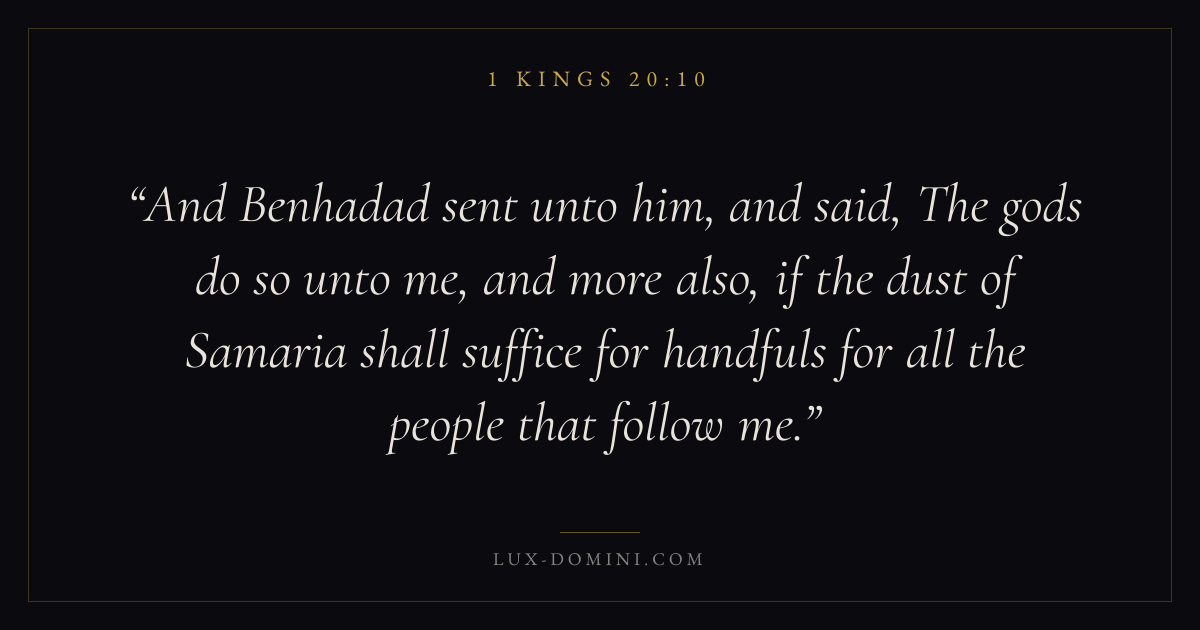And Benhadad sent unto him, and said, The gods do so unto me, and more also, if the dust of Samaria shall suffice for handfuls for all the people that follow me.