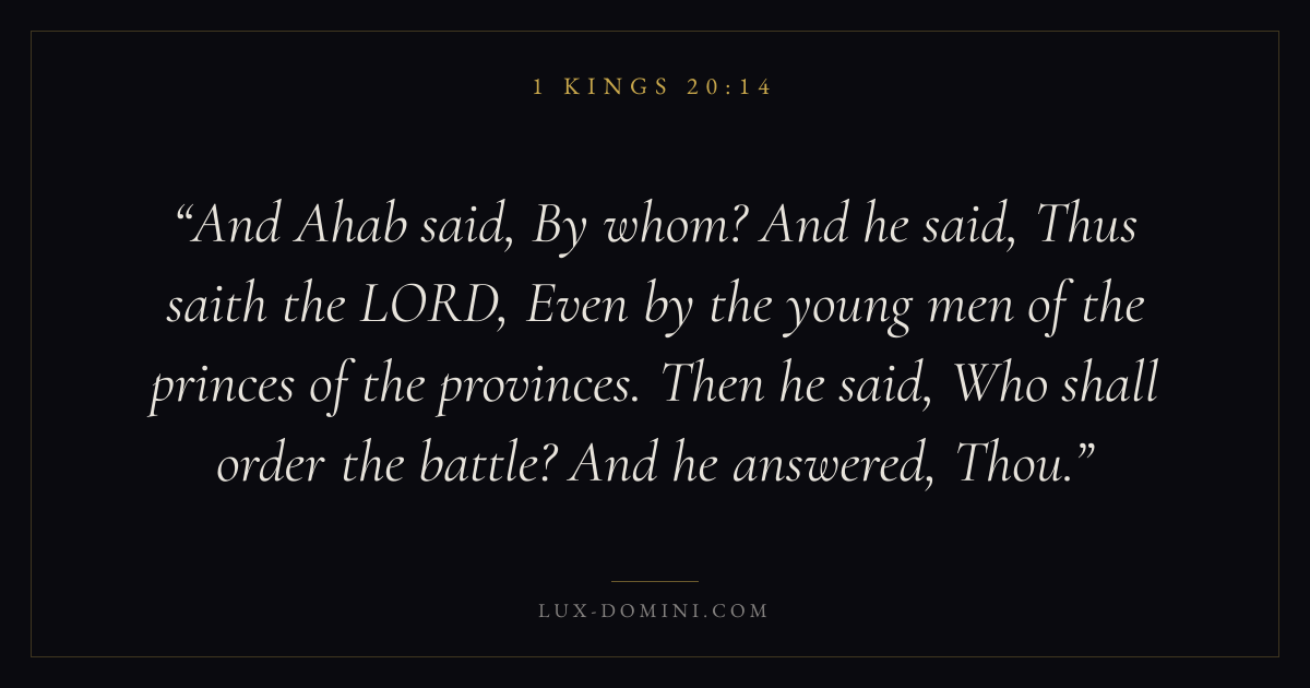 And Ahab said, By whom? And he said, Thus saith the LORD, Even by the young men of the princes of the provinces. Then he said, Who shall order the battle? And he answered, Thou.