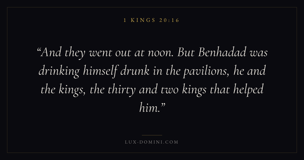 And they went out at noon. But Benhadad was drinking himself drunk in the pavilions, he and the kings, the thirty and two kings that helped him.