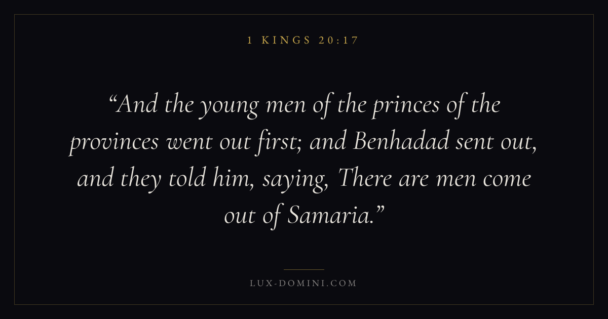 And the young men of the princes of the provinces went out first; and Benhadad sent out, and they told him, saying, There are men come out of Samaria.