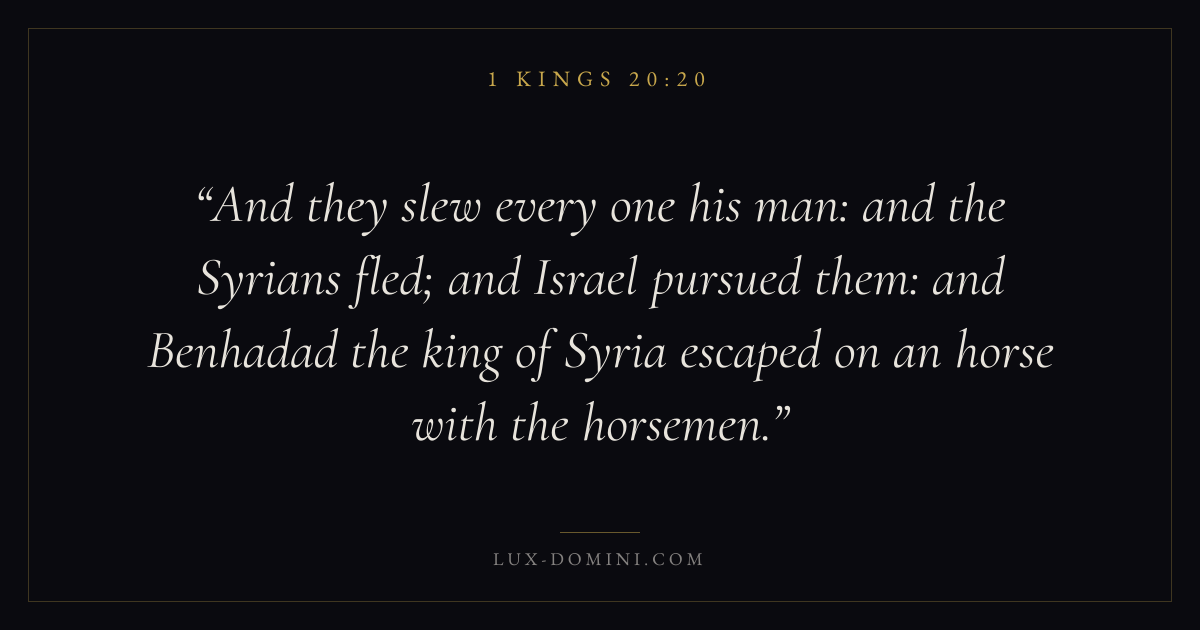 And they slew every one his man: and the Syrians fled; and Israel pursued them: and Benhadad the king of Syria escaped on an horse with the horsemen.