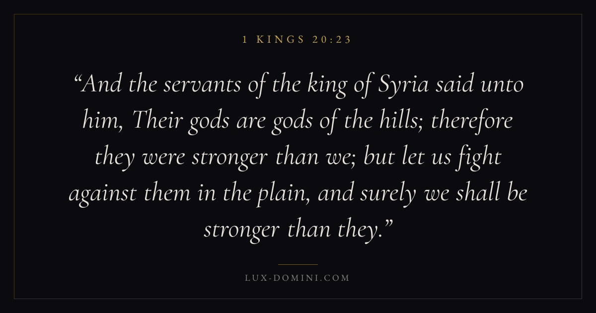 And the servants of the king of Syria said unto him, Their gods are gods of the hills; therefore they were stronger than we; but let us fight against them in the plain, and surely we shall be stronger than they.