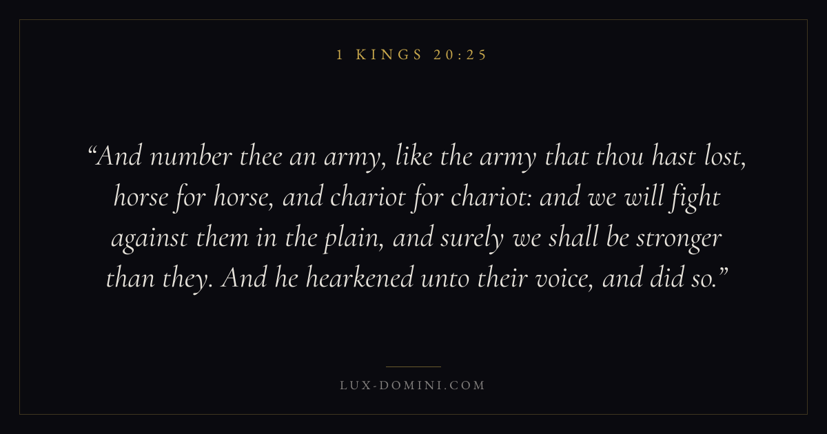 And number thee an army, like the army that thou hast lost, horse for horse, and chariot for chariot: and we will fight against them in the plain, and surely we shall be stronger than they. And he hearkened unto their voice, and did so.