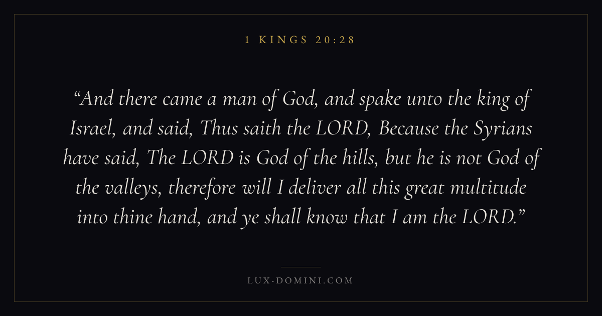 And there came a man of God, and spake unto the king of Israel, and said, Thus saith the LORD, Because the Syrians have said, The LORD is God of the hills, but he is not God of the valleys, therefore will I deliver all this great multitude into thine hand, and ye shall know that I am the LORD.