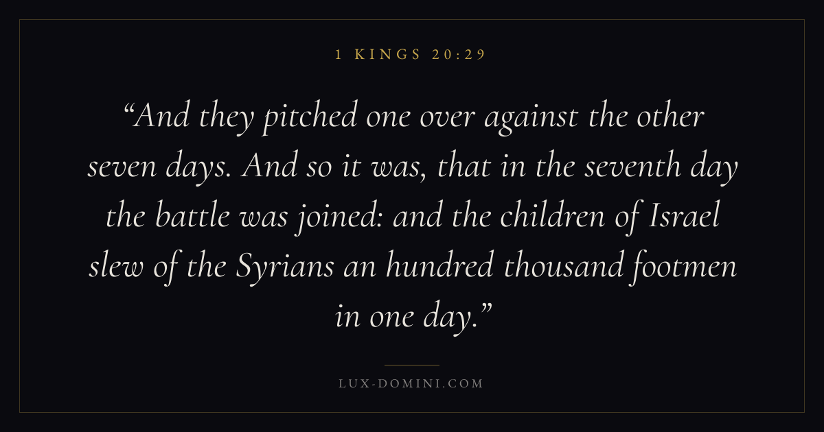 And they pitched one over against the other seven days. And so it was, that in the seventh day the battle was joined: and the children of Israel slew of the Syrians an hundred thousand footmen in one day.