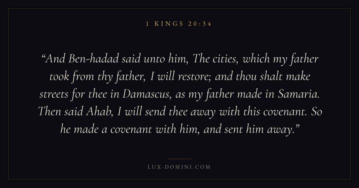 And Ben-hadad said unto him, The cities, which my father took from thy father, I will restore; and thou shalt make streets for thee in Damascus, as my father made in Samaria. Then said Ahab, I will send thee away with this covenant. So he made a covenant with him, and sent him away.