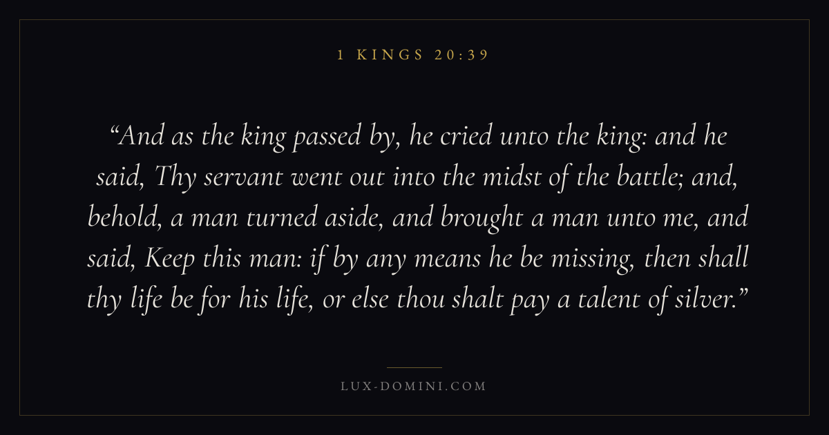 And as the king passed by, he cried unto the king: and he said, Thy servant went out into the midst of the battle; and, behold, a man turned aside, and brought a man unto me, and said, Keep this man: if by any means he be missing, then shall thy life be for his life, or else thou shalt pay a talent of silver.