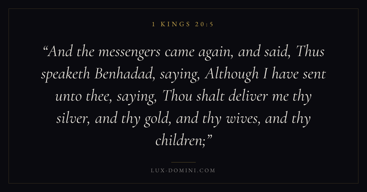 And the messengers came again, and said, Thus speaketh Benhadad, saying, Although I have sent unto thee, saying, Thou shalt deliver me thy silver, and thy gold, and thy wives, and thy children;