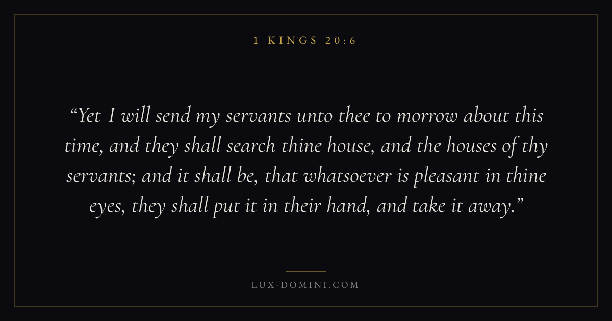 Yet I will send my servants unto thee to morrow about this time, and they shall search thine house, and the houses of thy servants; and it shall be, that whatsoever is pleasant in thine eyes, they shall put it in their hand, and take it away.