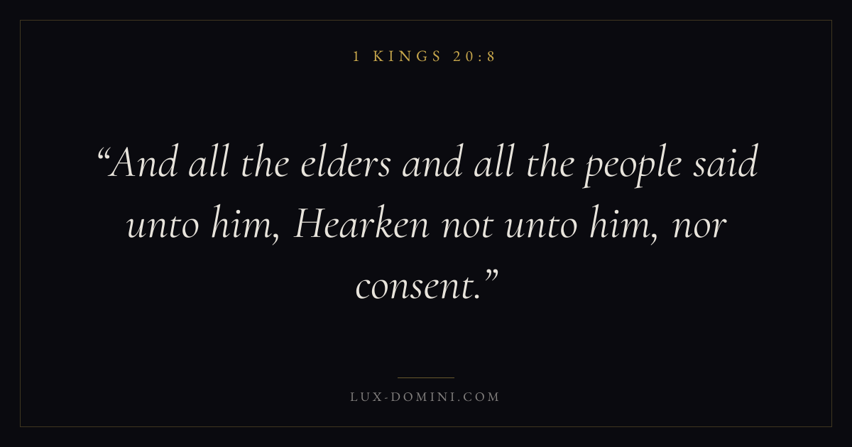 Books / 1 Kings / Chapter 20 / Verse 8 ← 1 Kings 20:7 1 Kings 20:8 1 Kings 20:9 → And all the elders and all the people said unto him, Hearken not unto him, nor consent. Download verse card Share on Twitter Share on Facebook Pin it ✦ Key themes WisdomJustice and mercyTempleIdolatry Read with 1 Kings 20:61 Kings 20:7Proverbs 1:7James 1:5 Related topics Bible verses about wisdomBible verses about justice and mercy ✦ 1 Kings Chapter 20 verses V. 1 V. 2 V. 3 V. 4 V. 5 V. 6 V. 7 V. 8 V. 9 V. 10 V. 11 V. 12 V. 13 V. 14 V. 15 V. 16 V. 17 V. 18 V. 19 V. 20 V. 21 V. 22 V. 23 V. 24 V. 25 V. 26 V. 27 V. 28 V. 29 V. 30 V. 31 V. 32 V. 33 V. 34 V. 35 V. 36 V. 37 V. 38 V. 39 V. 40 V. 41 V. 42 V. 43