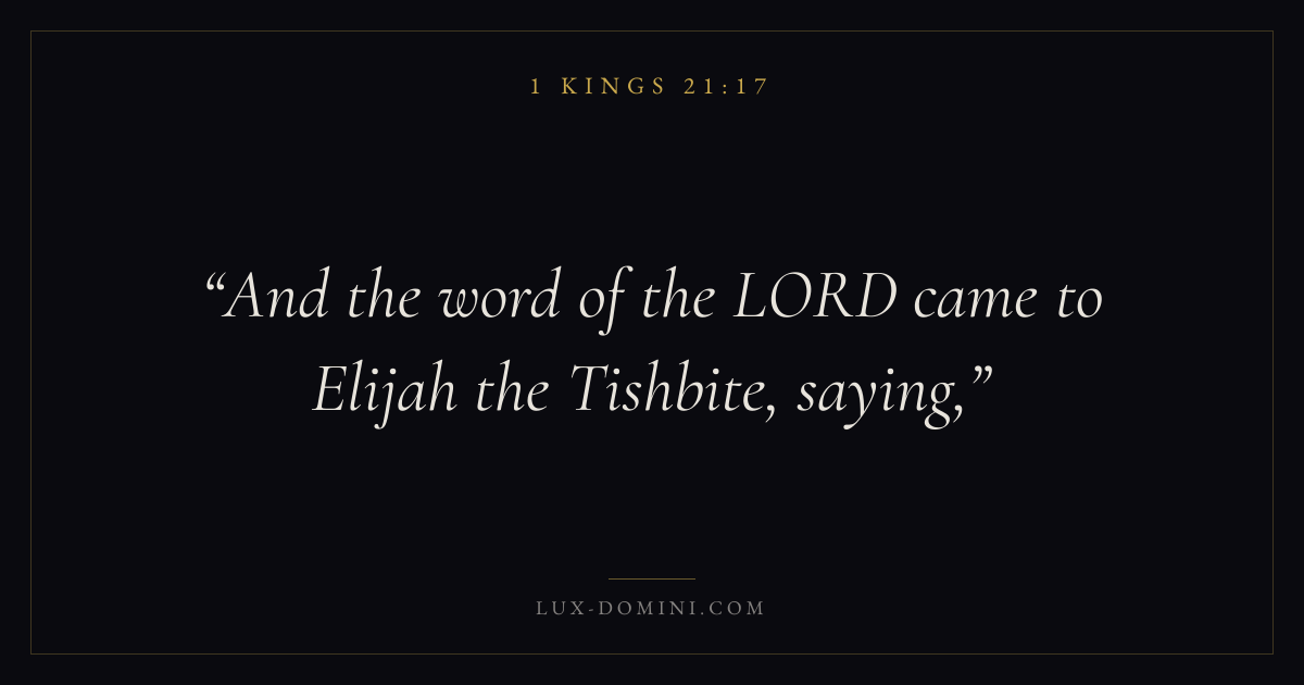 Books / 1 Kings / Chapter 21 / Verse 17 ← 1 Kings 21:16 1 Kings 21:17 1 Kings 21:18 → And the word of the LORD came to Elijah the Tishbite, saying, Download verse card Share on Twitter Share on Facebook Pin it ✦ Key themes WisdomJustice and mercyTruthTemple Read with 1 Kings 21:181 Kings 21:19Proverbs 1:7James 1:5 Related topics Bible verses about wisdomBible verses about justice and mercyBible verses about truth ✦ 1 Kings Chapter 21 verses V. 1 V. 2 V. 3 V. 4 V. 5 V. 6 V. 7 V. 8 V. 9 V. 10 V. 11 V. 12 V. 13 V. 14 V. 15 V. 16 V. 17 V. 18 V. 19 V. 20 V. 21 V. 22 V. 23 V. 24 V. 25 V. 26 V. 27 V. 28 V. 29