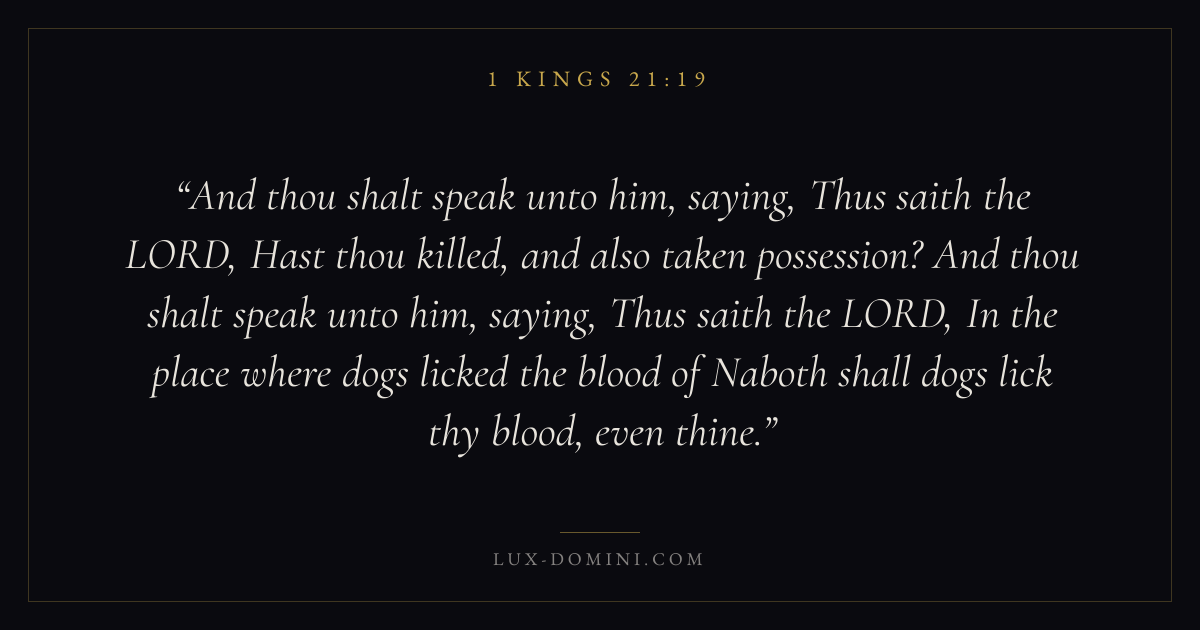 And thou shalt speak unto him, saying, Thus saith the LORD, Hast thou killed, and also taken possession? And thou shalt speak unto him, saying, Thus saith the LORD, In the place where dogs licked the blood of Naboth shall dogs lick thy blood, even thine.