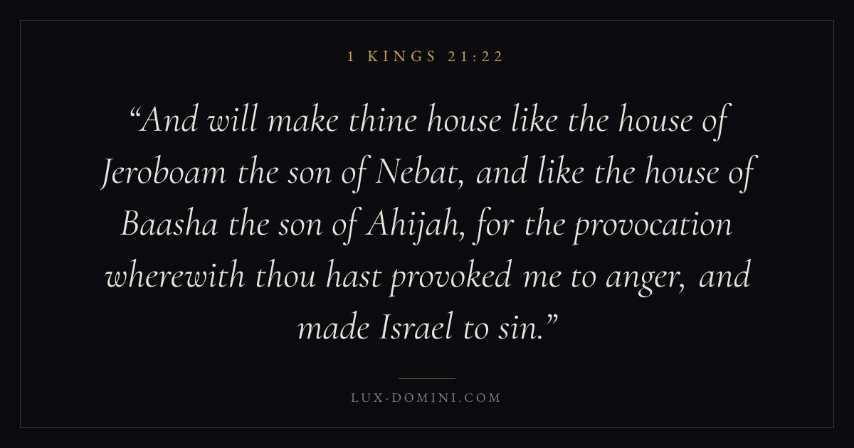 And will make thine house like the house of Jeroboam the son of Nebat, and like the house of Baasha the son of Ahijah, for the provocation wherewith thou hast provoked me to anger, and made Israel to sin.